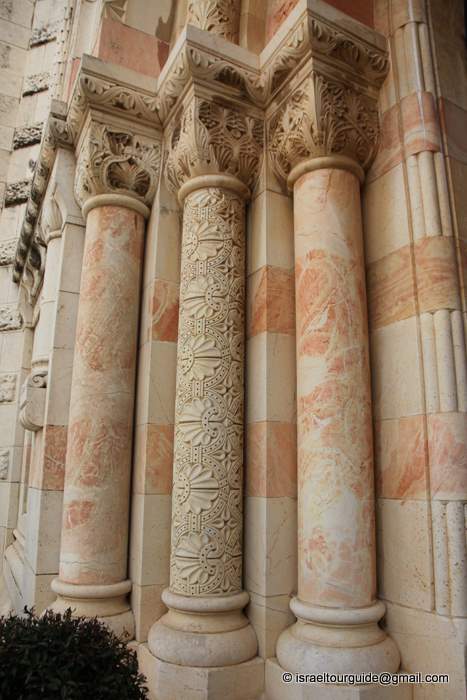 Inside the church you'll notice beautiful mosaics covering the prayer hall. These mosaics describe events in the lives of Jesus, Mary and the saints. Around the hall are six niches, each one is dedicated to a saint and each one was designed by a different German artist. On the floor the colorful tiles represent different themes. The largest and most dominant ring is the zodiac and in the center three rings intertwined represent the trinity. The outer circle of the mosaic floor has depictions of the Prophets and the twelve Apostles.